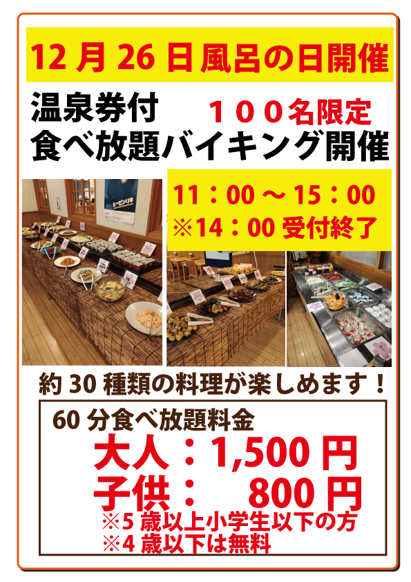 毎月26日の風呂の日サービスデーにレストランにて食べ放題バイキングを開催しています。